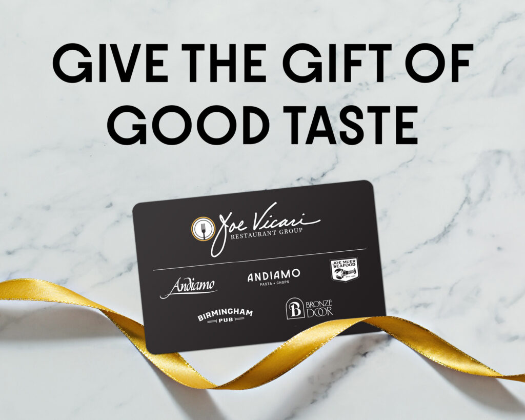 Get the perfect present for anyone on your list! Our gift cards can be used at Detroit area Andiamo locations, Joe Muer Seafood locations, Bronze Door, The Statler, and Birmingham Pub. Available for purchase at all locations and online.