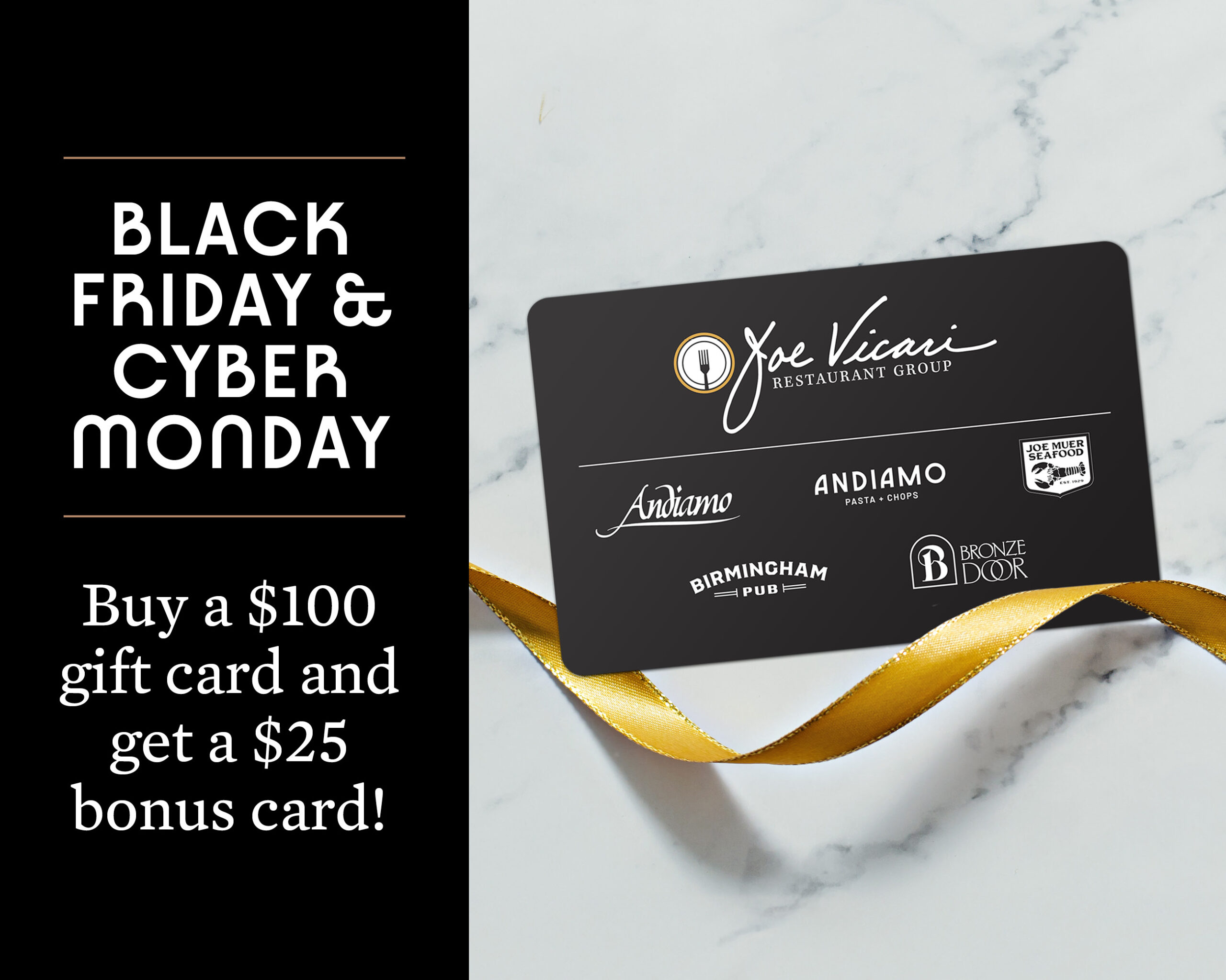 On Black Friday, November 28, purchase a $100 gift card in-store and receive a $25 bonus card to share the gift of fine dining at Andiamo Pasta & Chops.